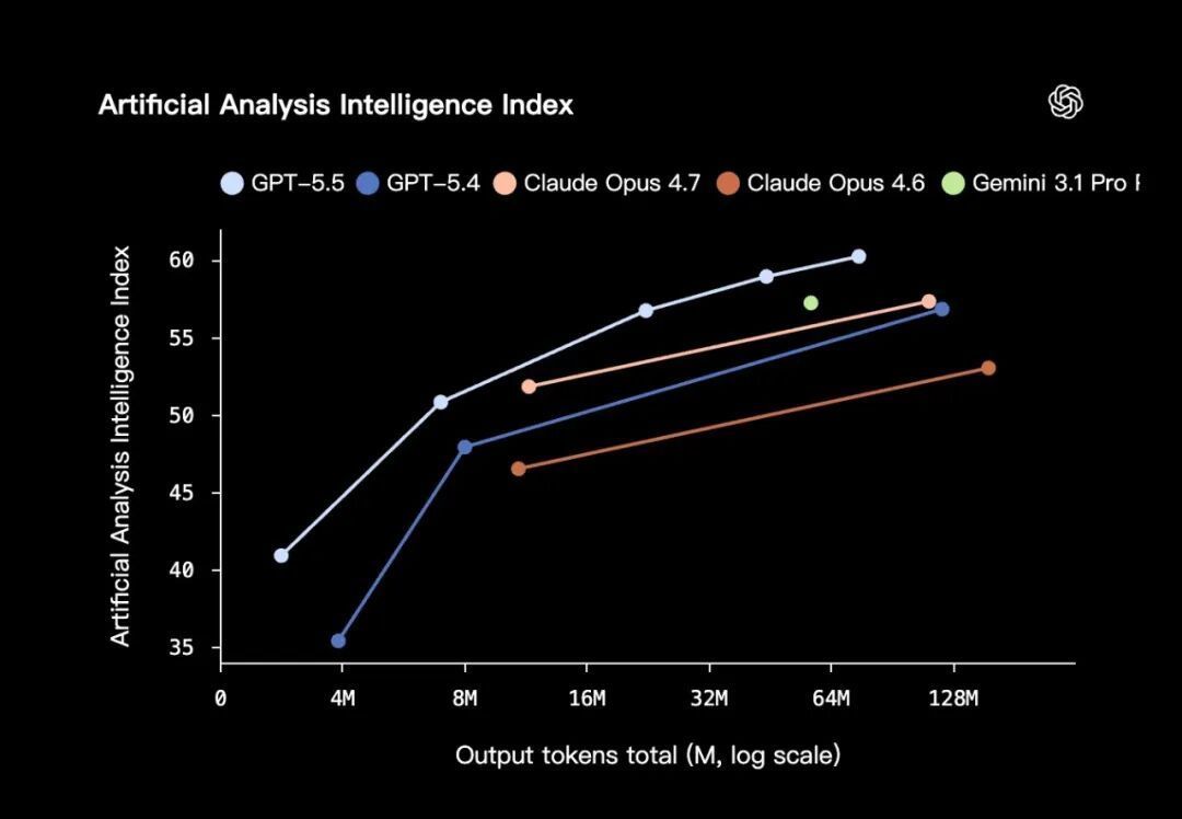 从底层硬件的协作来看,这套模型针对英伟达 GB200/GB300 NVL72 系统做了联合设计。结果是,它的每 token 延迟被保持在与 GPT-5.4 持平的水平上,同时通过负载均衡优化,token 生成速度反而提升了超过 20%;在执行同样的 Codex 任务时,GPT-5.5 所消耗的 token 数量也显著更少。